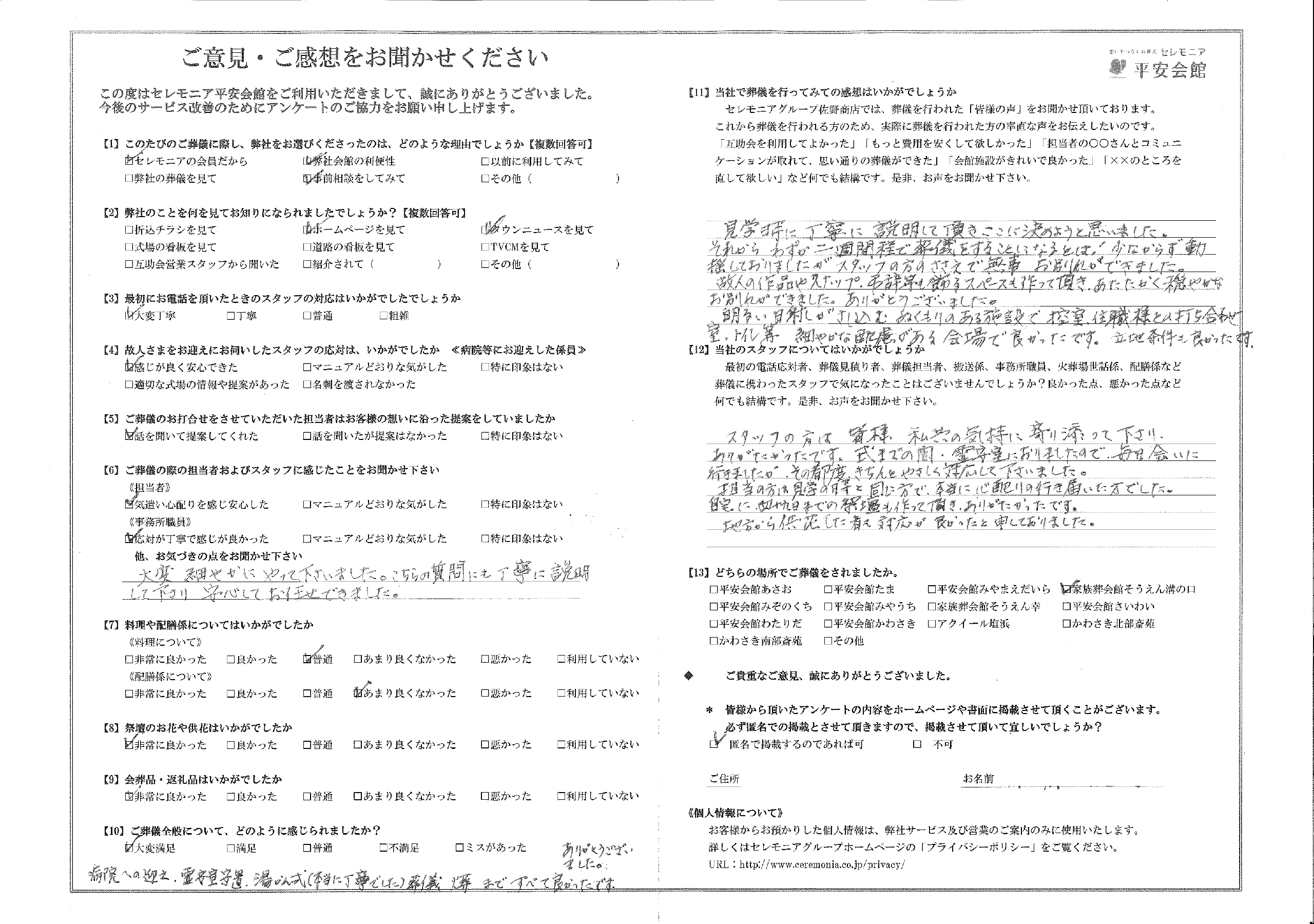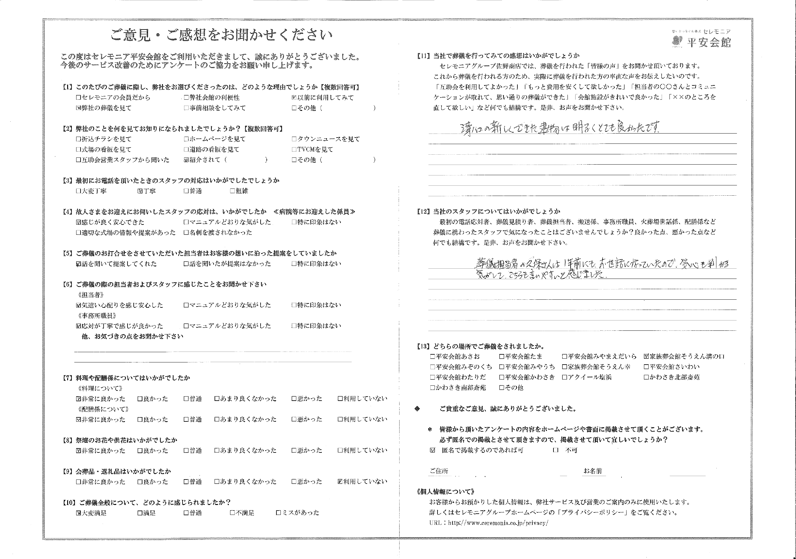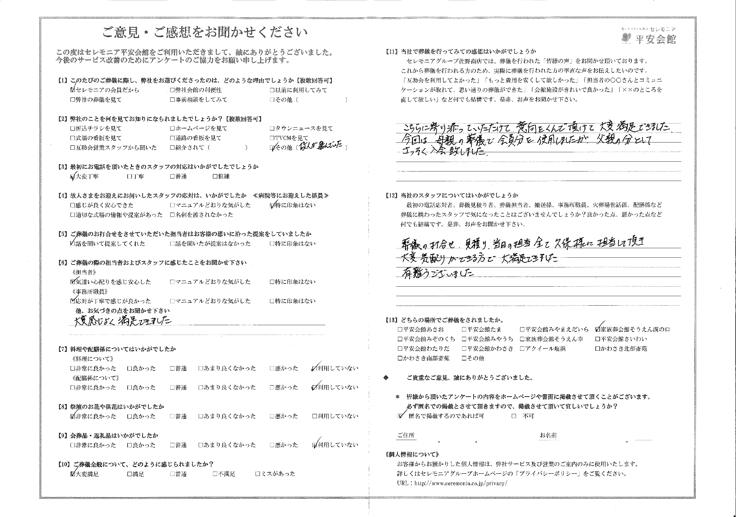 平安会館をご利用いただいたお客さまより、感謝のお声を頂きました